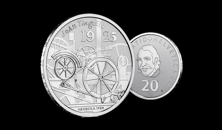 Die Silbermünze ist eine Hommage an einen der einflussreichsten Schweizer Künstler des 20. Jahrhunderts. Für Tinguely war die Maschine viel mehr als nur ein mechanisches Objekt: Sie verkörperte Humor, Poesie und die ständige Bewegung des Lebens. Seine Werke, die zwischen Weisheit und Wahnsinn oszillieren, inspirieren die zeitgenössische Kunst bis heute. Die Bildseite der Münze zeigt ein Element von Heureka, der ikonischen Skulptur, die für die schweizerische Landesausstellung 1964 in Lausanne geschaffen wurde und heute in Zürich steht. Dieses Werk, das aus ineinander verschlungenen Rädern und Mechanismen besteht, veranschaulicht perfekt Tinguelys Vision, die traditionellen Kunstcodes durch die Integration neuer Materialien zu brechen. Der Name «Jean Tinguely» ist im oberen Teil im Collagenstil zu sehen, eine Anspielung auf eine seiner bevorzugten künstlerischen Techniken. Das Geburtsjahr 1925 wird hervorgehoben, um auf den 100. Geburtstag des Künstlers im Jahr 2025 hinzuweisen. Die Rückseite zeigt ein Frontalporträt von Jean Tinguely, gezeichnet mit Strichen, die die Konturen seines Gesichts umreissen. Diese grafische Gestaltung erinnert an sein künstlerisches Universum, in dem sich Linien, Formen und mechanische Strukturen zu Werken in ständiger Bewegung verbinden.